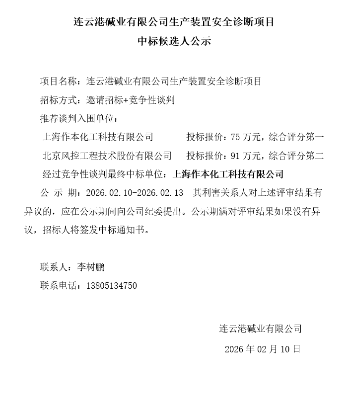 連云港堿業有限公司生產裝置安全診斷項目中標候選人公示